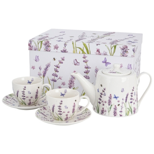 Conjunto de porcelana de tetera de 0,9 l. con 2 tazas con plato de 0,27 l. Incluye filtro de acero inoxidable, en caja de regalo.