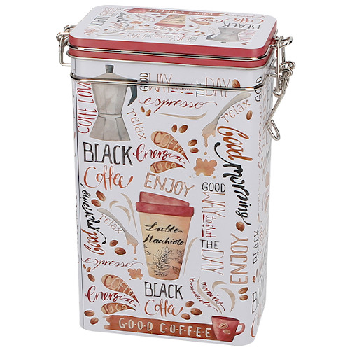Lata rectangular, con tapa hermética, para conservar 500 gr. de té o café. 11,7cm largo. 7,6cm ancho. 19,6cm alto.