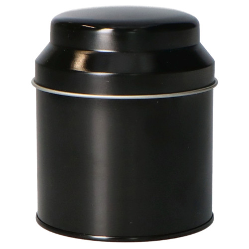 Lata negra redonda, con tapa a presión, para conservar 100 gr. de té. 9cm diámetro. 11,5cm alto.