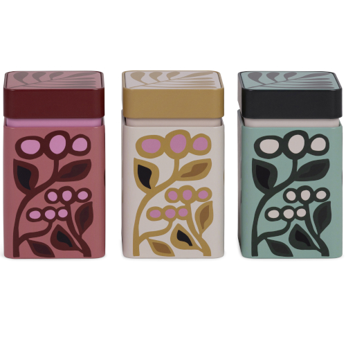 Lata cuadrada, con tapa gruesa, a presión, para conservar 100 gr. de té. 7cm largo. 7cm ancho. 10,9cm alto. 3 modelos.
