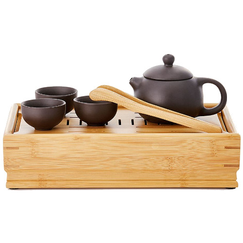 Set de arcilla zisha de tetera de 0,16 l. con 3 cuencos de 0,03 l. en bandeja de bambú, estilo Yixing. Incluye pinzas de bambú.