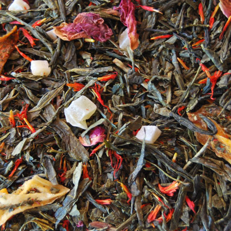 Té verde sencha, trozos de mango, mango confitado, pétalos de rosa, flor de cártamo y aromas de frutas tropicales.